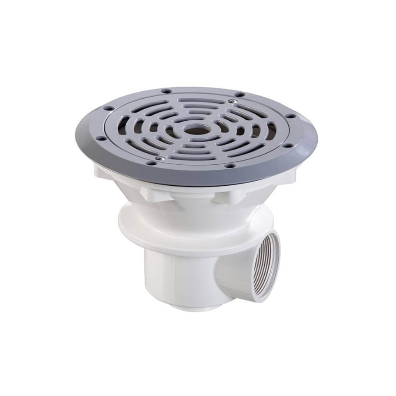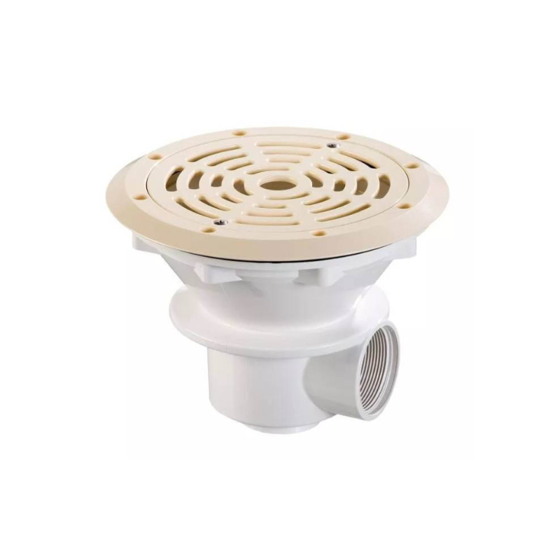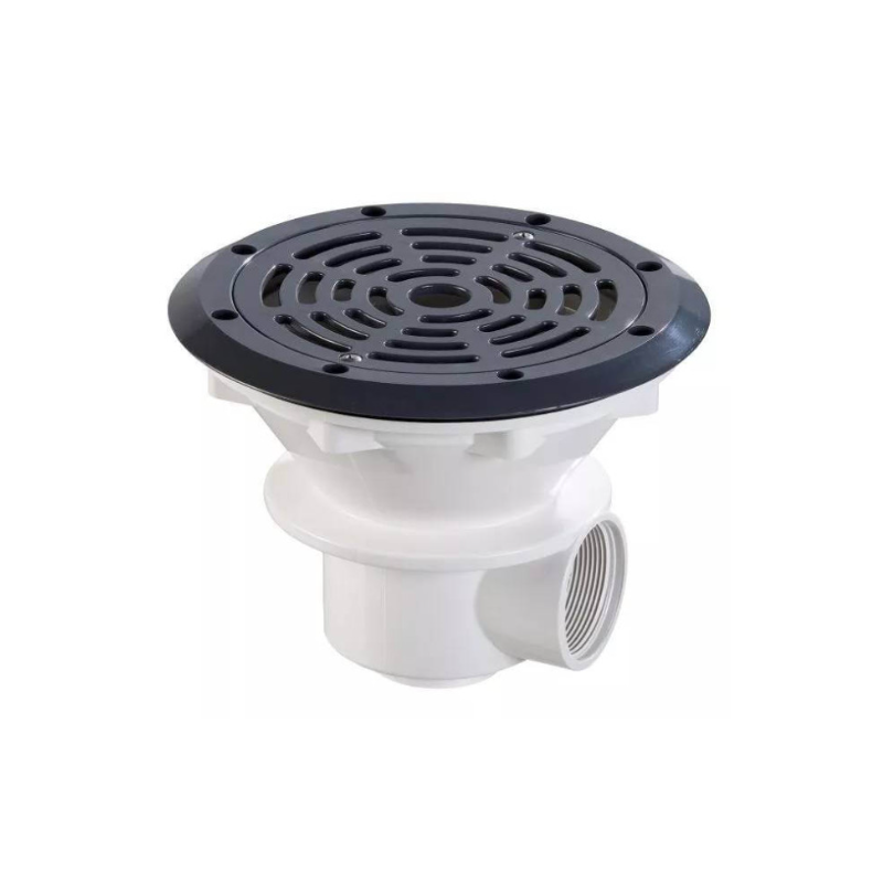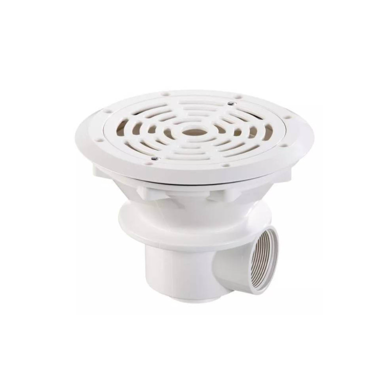 En ABS blanc. Sortie latérale 2” et sortie inférieure 1"1/2. Sortie inférieure fermée. Possibilité de montage d'un tube de drainage ( - Ref.. 43502). Débit maximal de 11 m3/h.