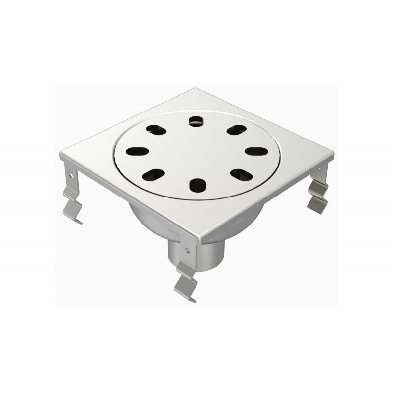 Siphon en acier inox EN 1.4301 200 x 200 mm, hauteur 85 mm, sortie verticale diamètre 63 mm, écoulement 0.75 l/s env., garde d'eau 50 mm, rosette libre résistant à une charge concentrée (40 x 10) de 8 kN.